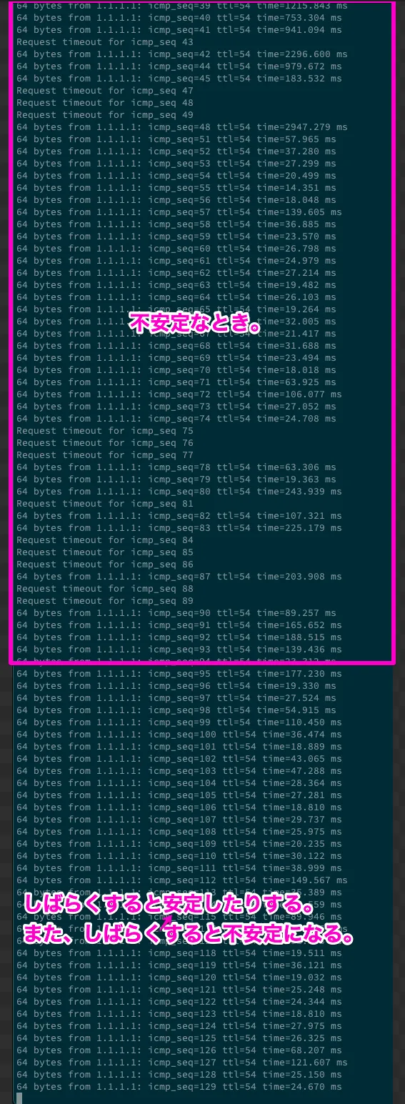 しばらくpingの様子を見ていたら、調子が良くなりました。そして、また調子が悪くなったりします。
