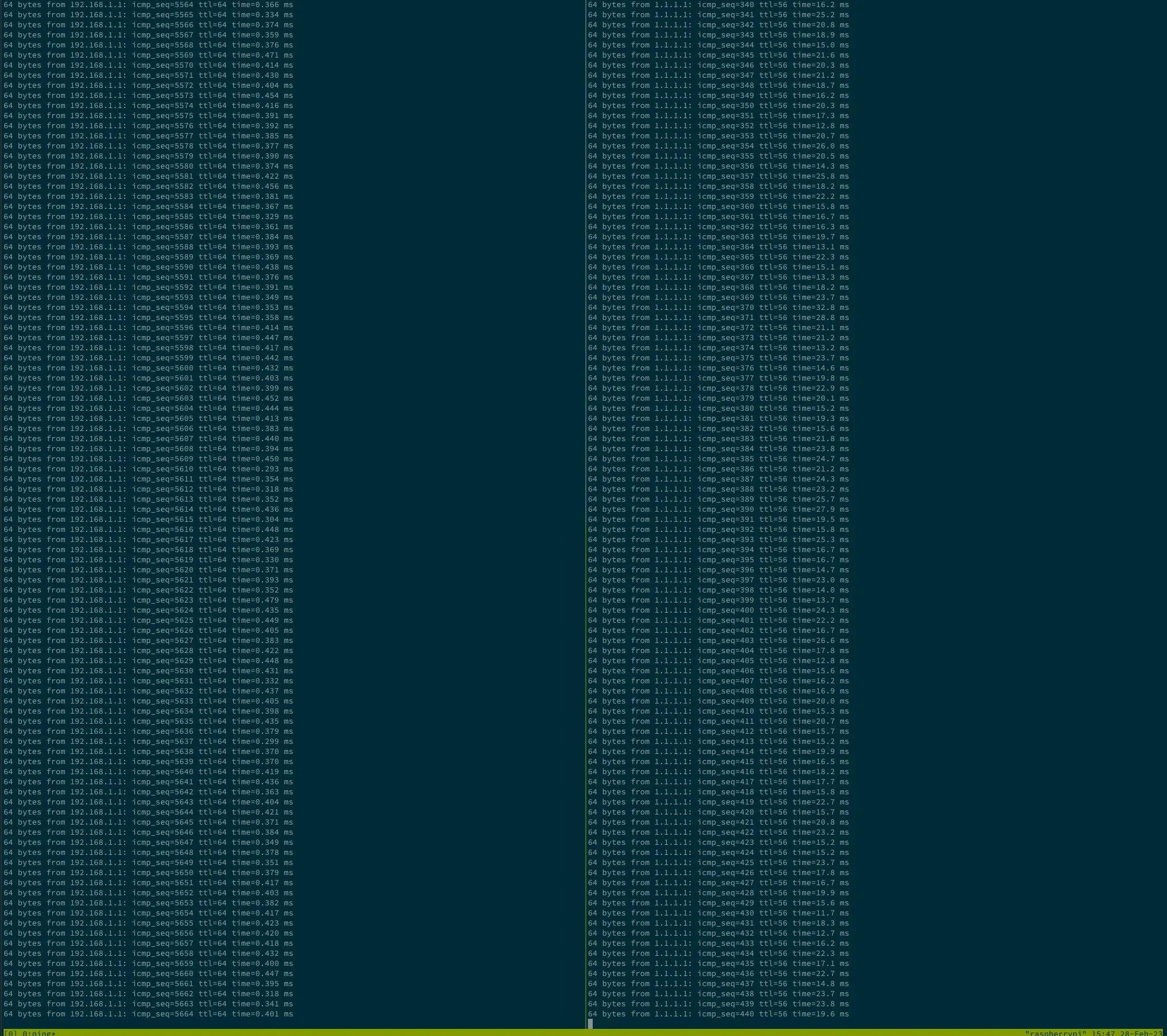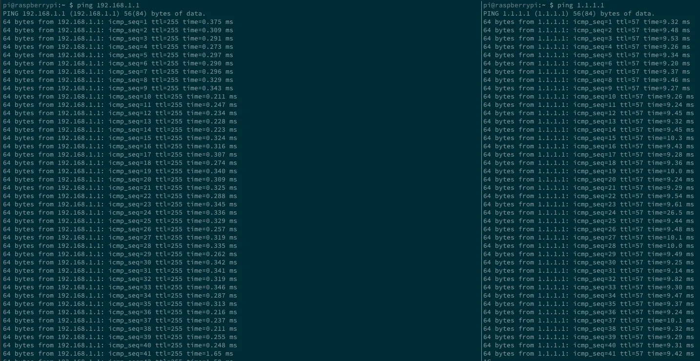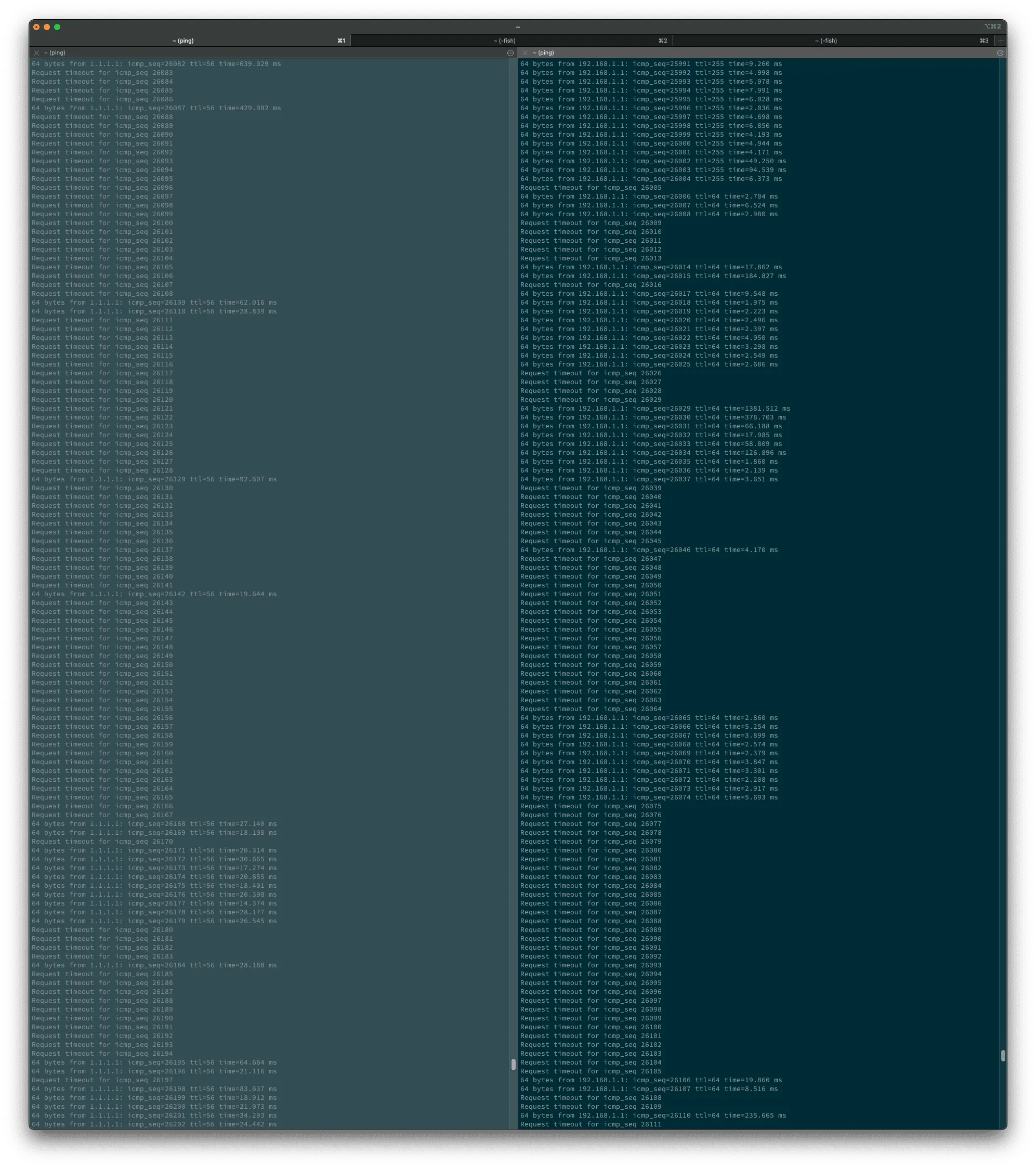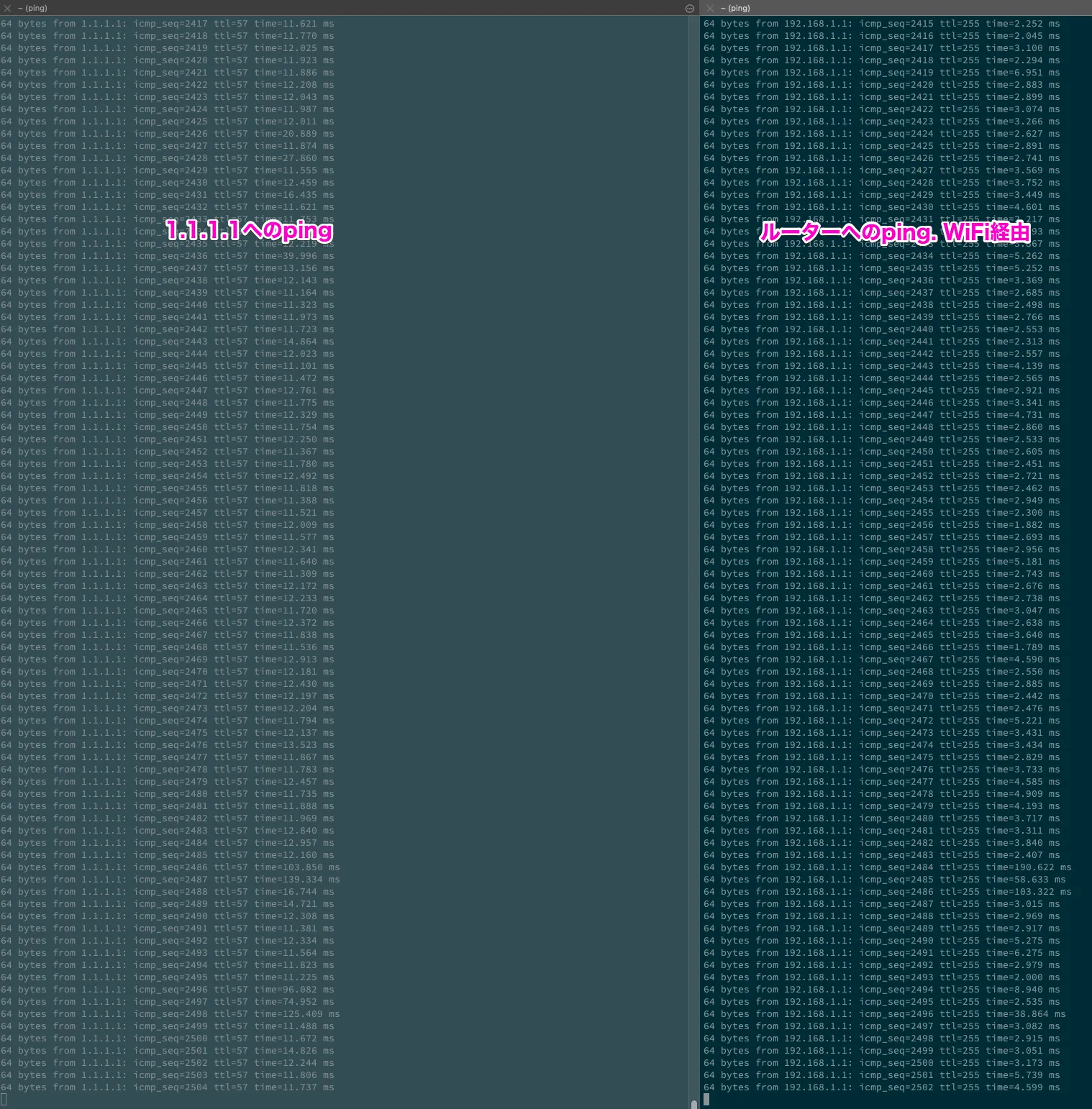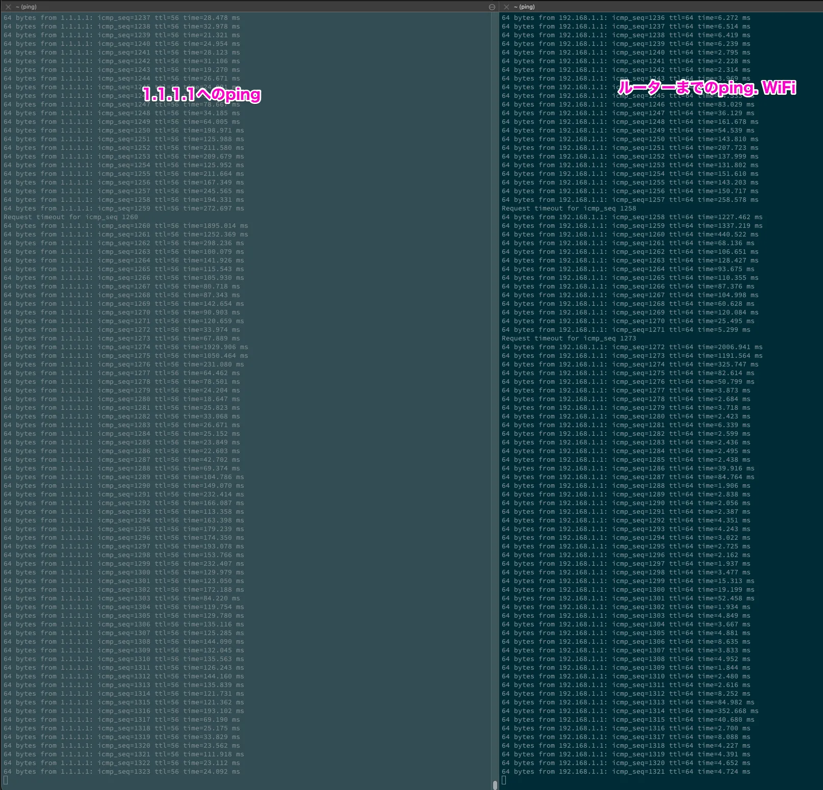左がCloudflare public DNSに対してのping結果。右がルーターのNICへのping結果。