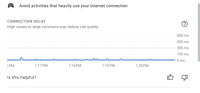 参考までに、google meetでは300ms以下であれば問題ない数値と定義している様子。このグラフは固定回線+無線LANのとき。片道だから10ms台。
