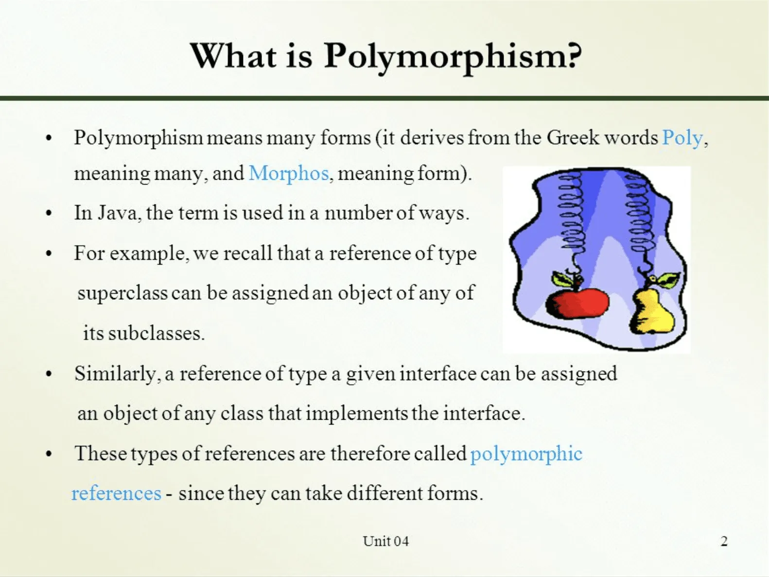 This feature, referred to as polymorphism, plays a significant role in the design of object-oriented programs. Together with dynamic binding, it permits you to write code that might apply to any number of different kinds of objects, without your having to choose at the time you write the code what kinds of objects they might be. They might even be objects that will be developed later, by other programmers working on other projects. If you write code that sends a display message to an id variable, any object that has a display method is a potential receiver.