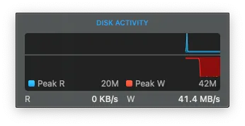 ディスクのアクティビティを見ると、ReadとWriteが同程度活発に動いています。エンクロージャのランプは、HDD1が点灯して、HDD2が点灯しているのでディスクのデータをOS経由でコピーしているようです。