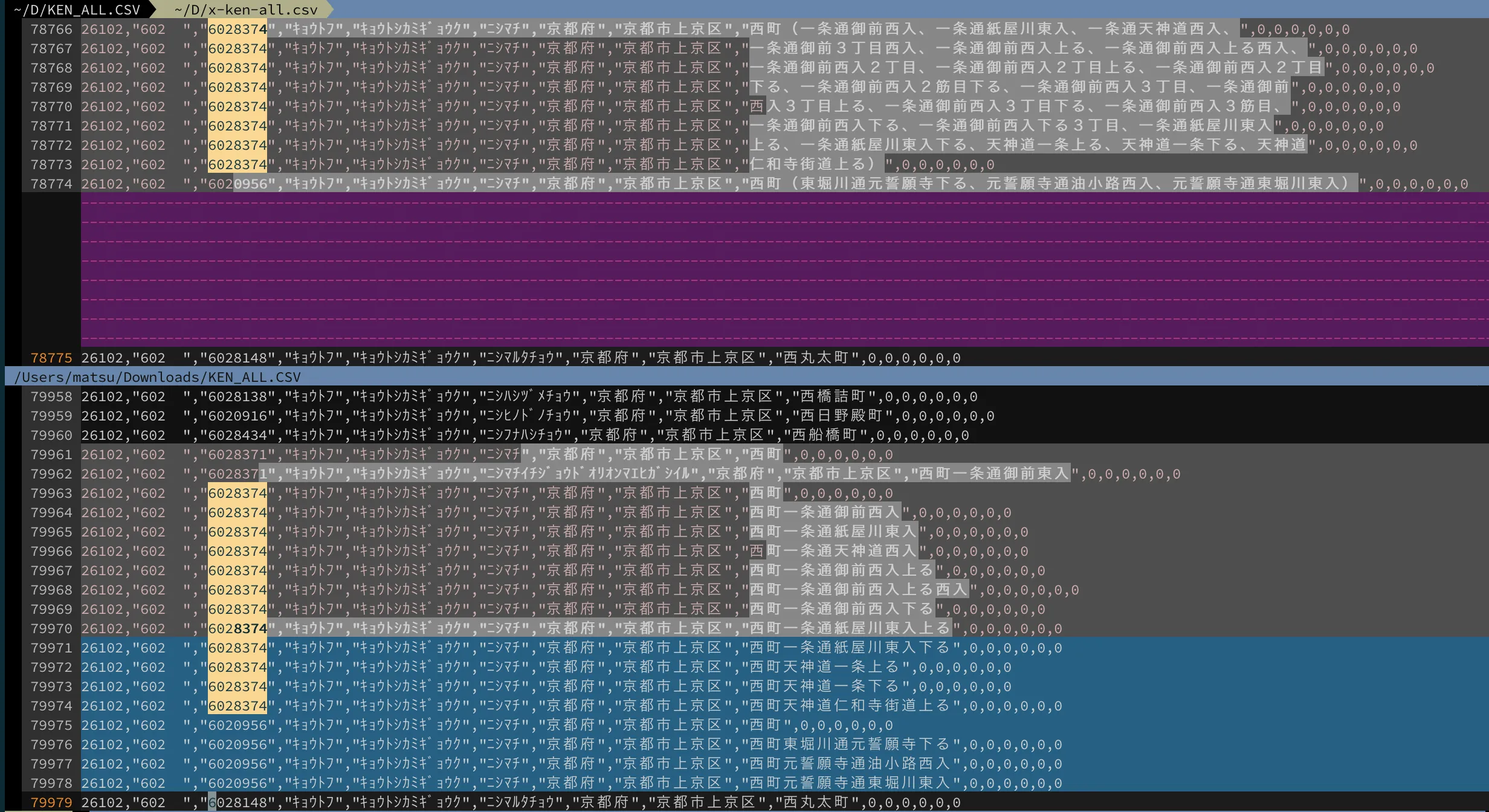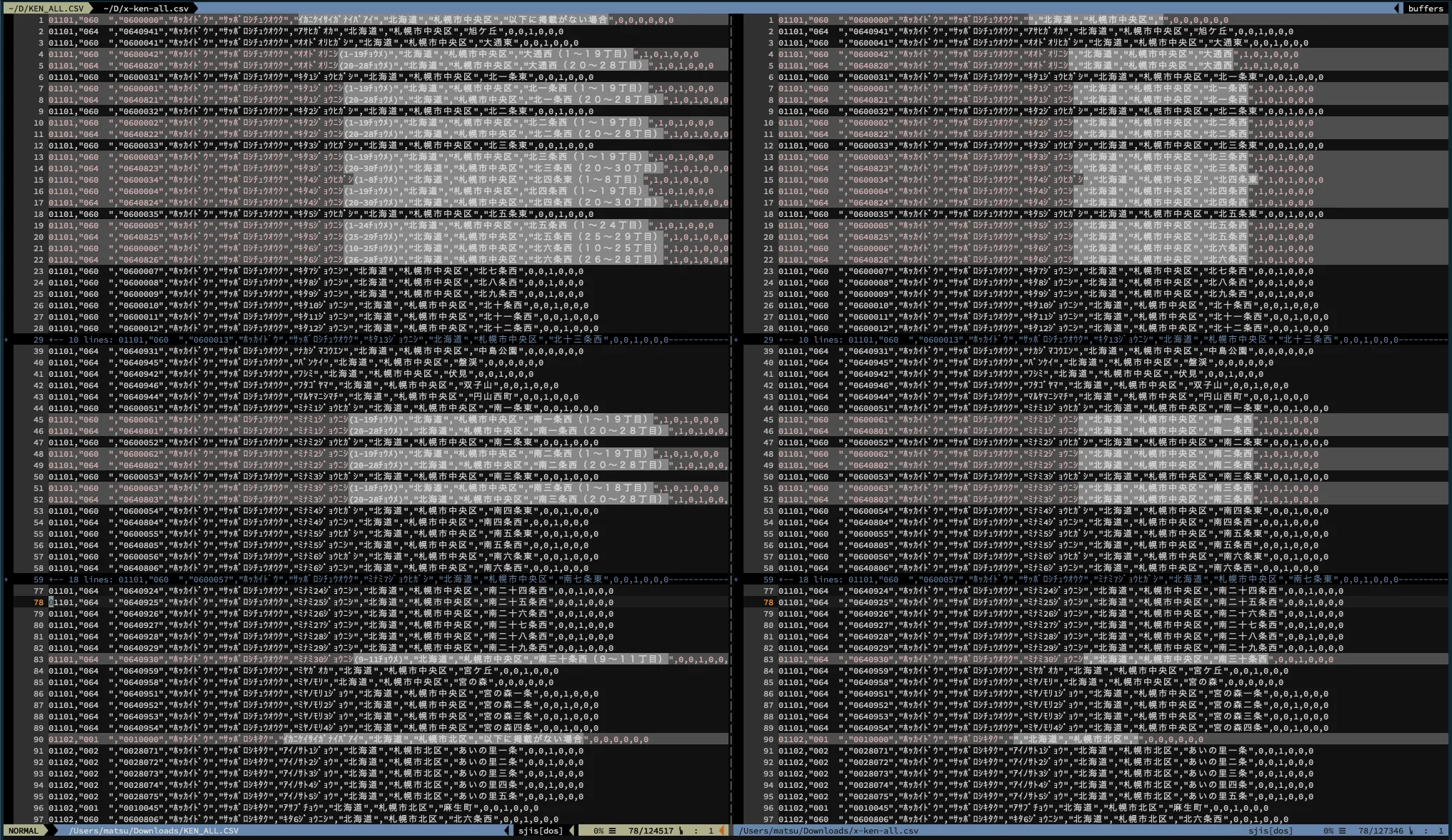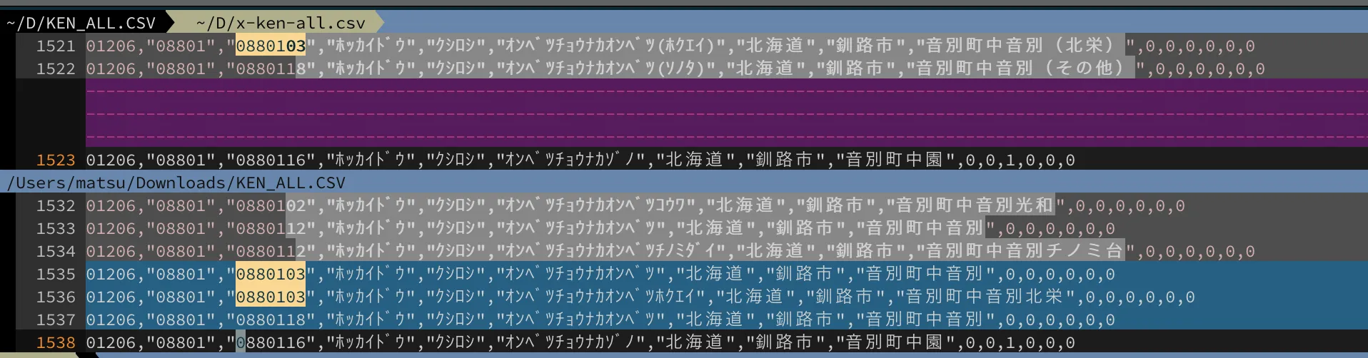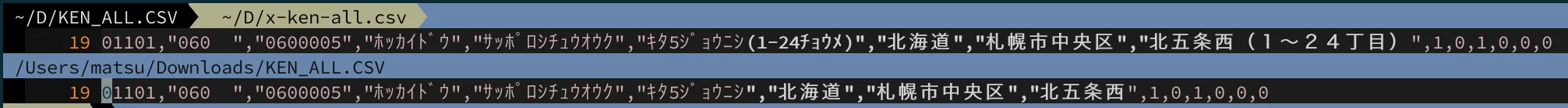 - 左が郵便局が提供しているデータ、右がzipcloudが提供しているデータのvimdiffです。