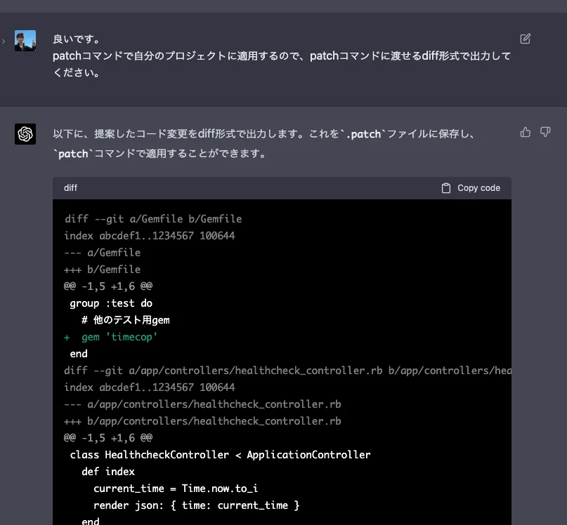 1 つ上位の視点で考えると、なんで Chat-GPT の結果を自分でコピー&ペーストして、他のプロジェクトに利用できるように diff を貼り付けているのだろう。 ここまでの流れをやらせれば良いのでは? と思いました。
