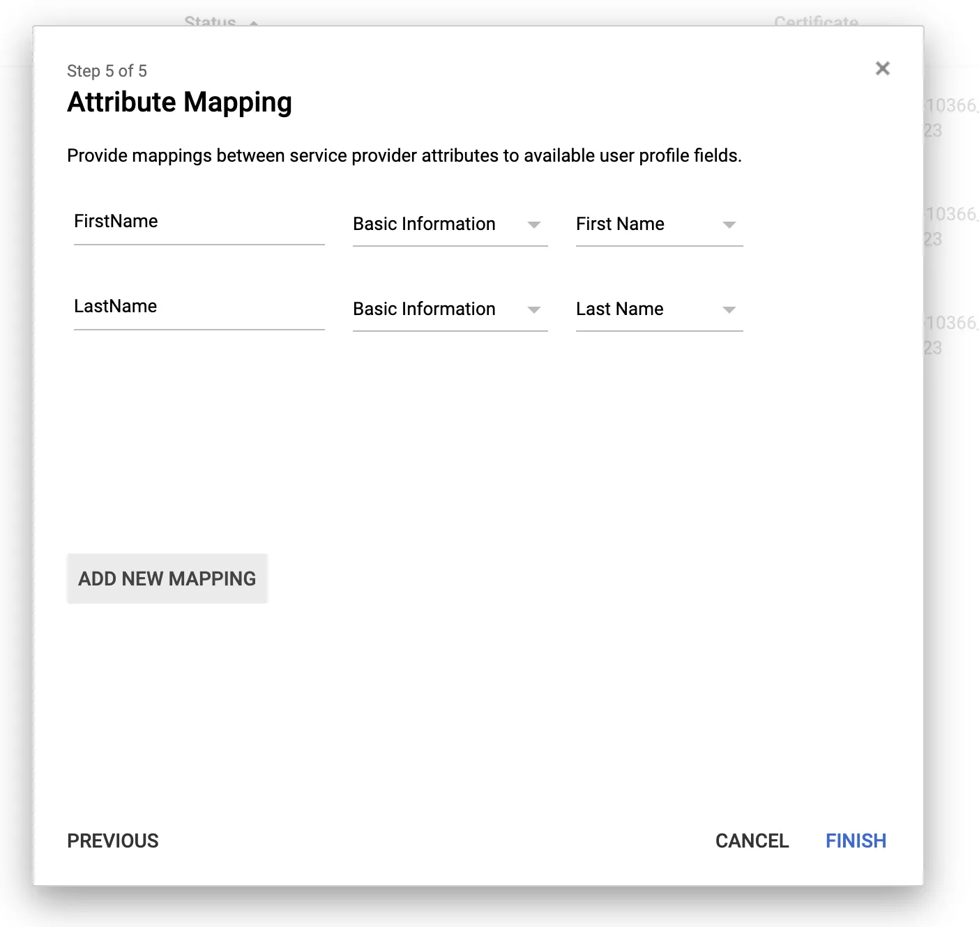 Attributeのマッピングを以下のように設定します。後ほど設定もできます。(これを設定しないとRedash側でエラーが起きてSSOができません)