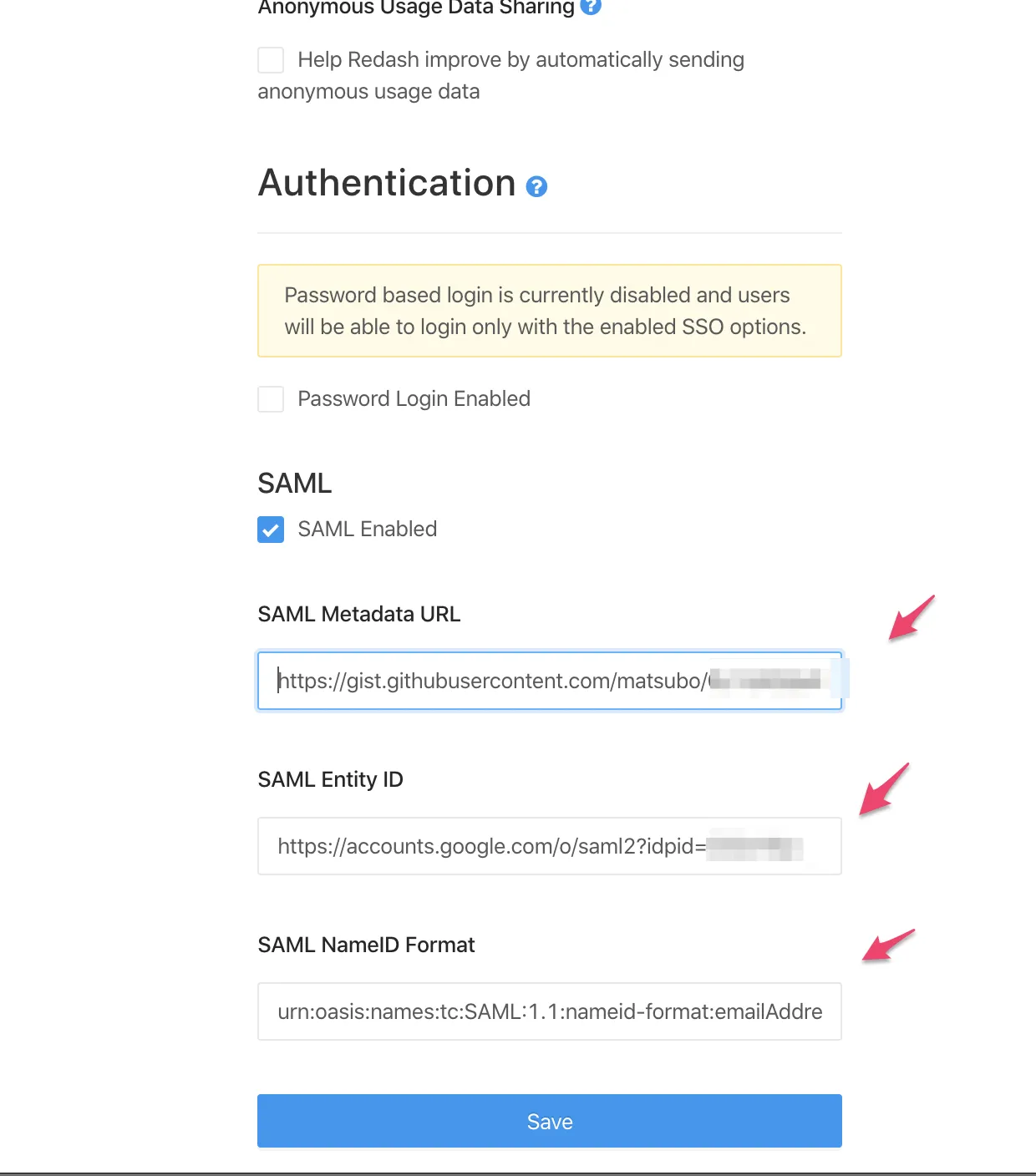 RedashはIDpメタデータによる連携に対応しているので、このファイルをダウンロードしてRedashからアクセスできるURLに保存しておきます。