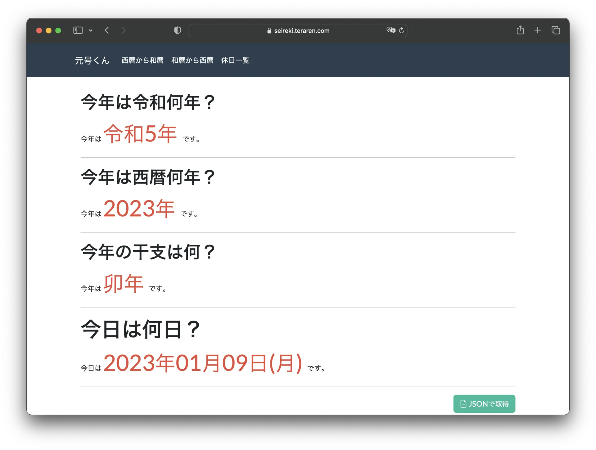 % curl -s https://seireki.teraren.com/seireki/1950.json | jq '.age'732023年の休日一覧を取得