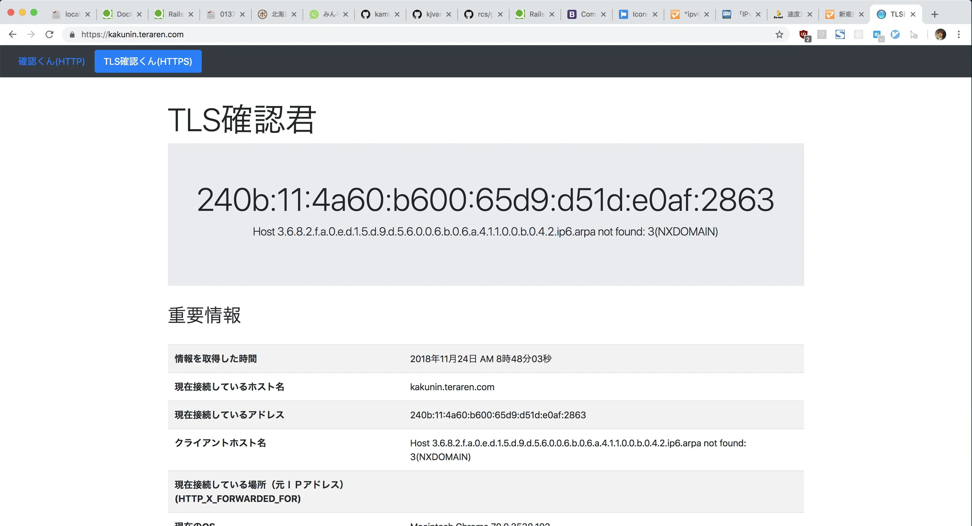 ということで、ローカルネットワークで利用するDNSキャッシュサーバのアドレスを変えたら無事にIPv6で繋がった模様。確認君もIPv6対応済み。IPv6かどうかを表示するようにした。