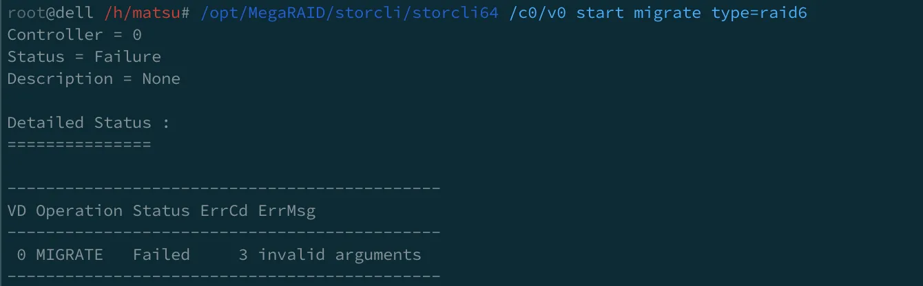 root@dell /h/matsu# /opt/MegaRAID/storcli/storcli64 /c0/v0 start migrate type=raid6Controller = 0Status = FailureDescription = None