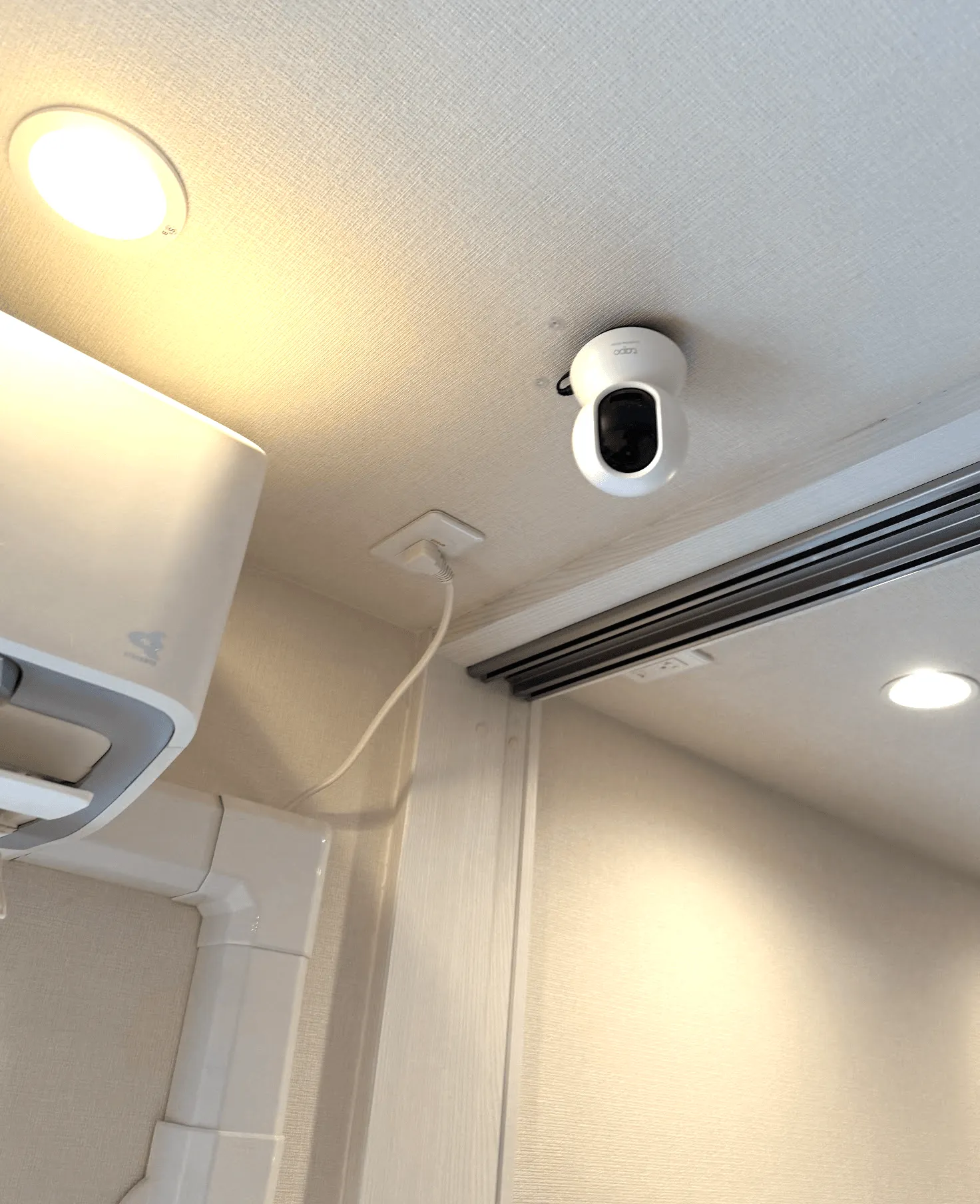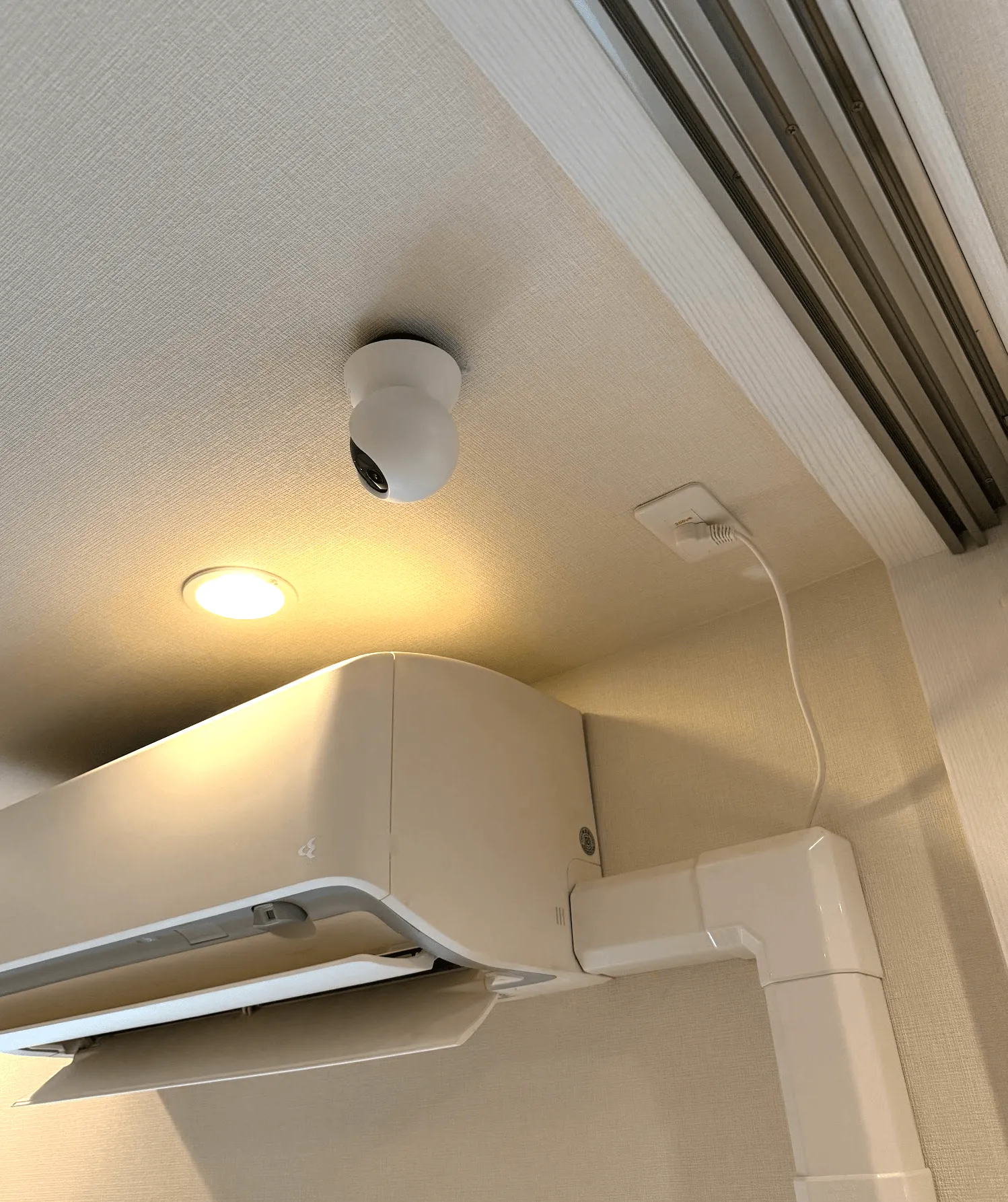 石膏ボードに穴を開けて、電源はエアコン用に来ていたので電圧を確認したら100Vだったので天井裏で分岐して、コンセントを作って、tapoのACアダプタをぶち込みました。これで死角ができなくなります。