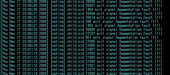 [Thu Dec 17 22:56<22>22> 2009] [notice] child pid 2121 exit signal Segmentation fault (11)