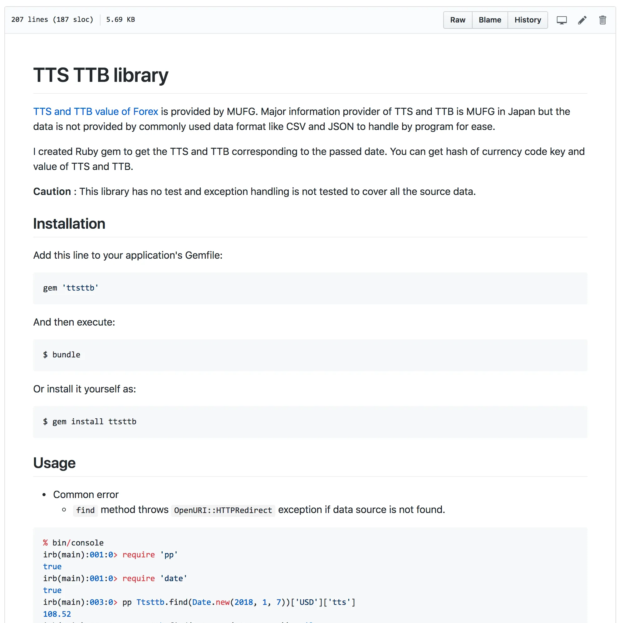 そこで、rubyで東京三菱UFJ銀行のTTS、TTBが掲載されているページをスクレイピングして取得するライブラリを書いてみました。