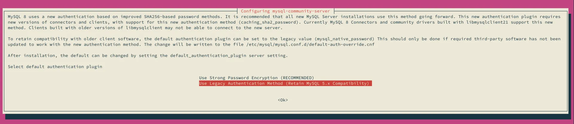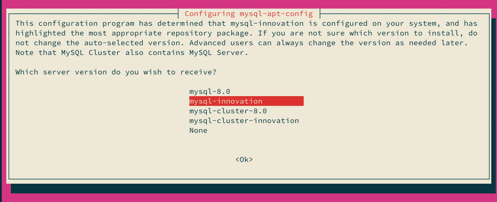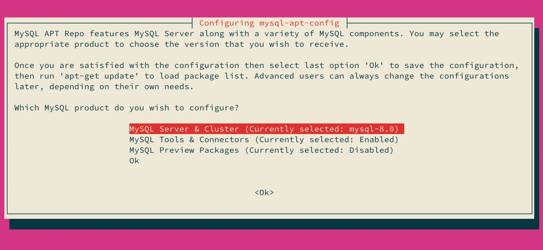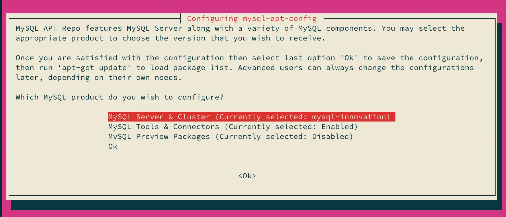 % wget https://dev.mysql.com/get/mysql-apt-config_0.8.26-1_all.deb% sudo dpkg -i mysql-apt-config_0.8.26-1_all.debインストール中に以下のようなダイアログが立ち上がり、どのプロダクトを使いたいかを選択します。デフォルトではLTSになっています。