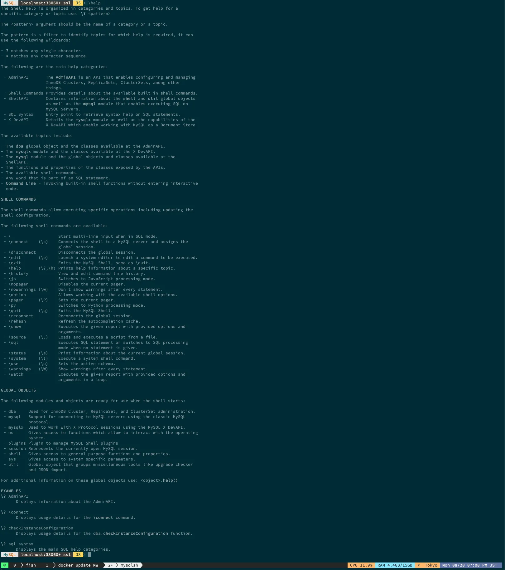mysqlshの使い方は\helpと入力するととても長い説明が表示されますが、一通り読んでおくのが良いと思います。いろいろできるので。