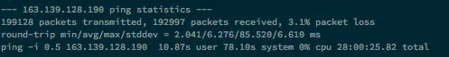 --- 163.139.128.190 ping statistics ---199128 packets transmitted, 192997 packets received, 3.1% packet lossround-trip min/avg/max/stddev = 2.041/6.276/85.520/6.610 msping -i 0.5 163.139.128.190 10.87s user 78.10s system 0% cpu 28:00:25.82 total4. ローカルPC→ヤフー