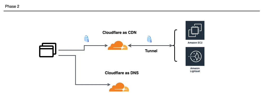 origin側にCloudflareのdaemonを動かして、tunnelを設定できます。cloudflareとoriginの間のトラフィックをこのtunnelを通すことによってoriginサーバ側でポート開放をする必要が無くなります。