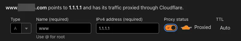 レコードを追加する際に普通とは違うのが、“Proxy status” というスイッチがあることです。このスイッチをonにするとDNS zoneサーバのレスポンスは登録したIPアドレスなどではなく、CloudflareのReverse proxyサーバのアドレスに置き換わります。