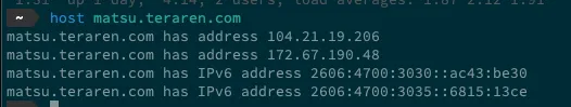 このblog.teraren.comのサイト自体もCloudflareを使っているのでDNSを引くとReverse proxyのアドレスが返ってきます。