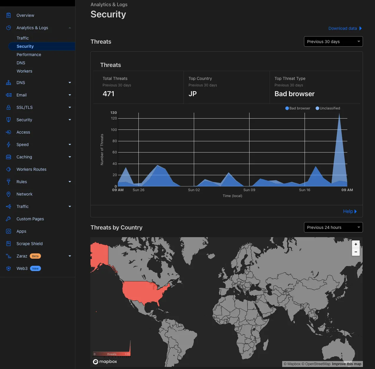 Cloudflareのダッシュボードをチラ見せしますとこんな感じになります。左のメニューを見てもらうとわかると思うのですが、Webサービスを運用する上で便利な機能が用意されています。