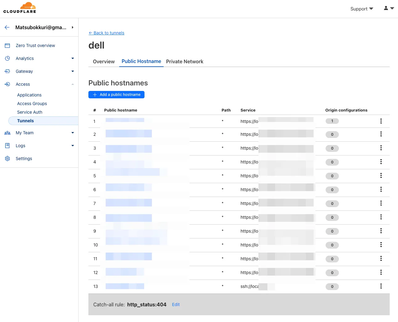 以下のようにpublicのホスト名と、originのサービス名を登録していきます。ここで登録するとCloudflareのDNSの設定にレコードが追加されていきます。既存のレコードと重複する場合はエラーが出ます。