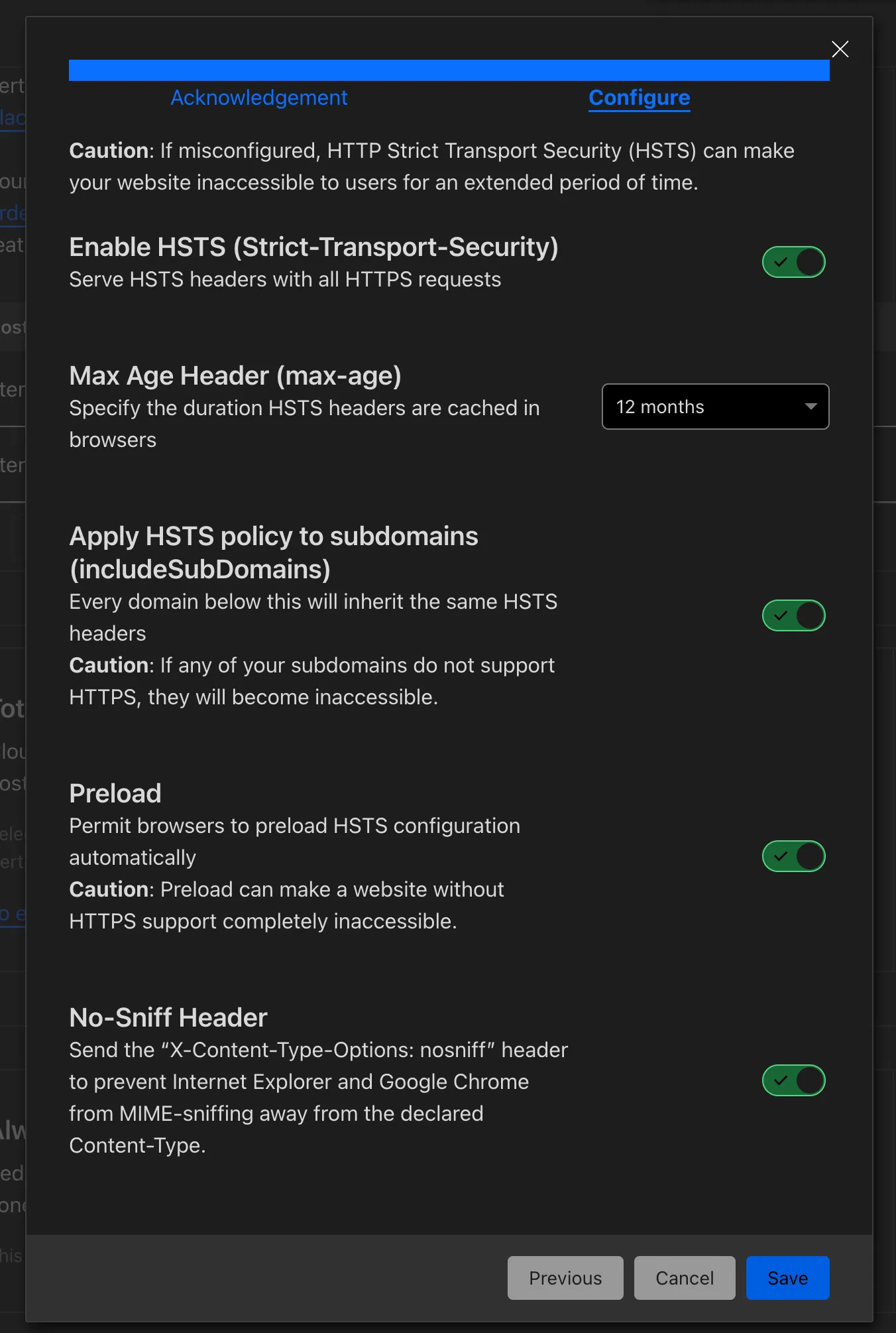 TLS証明書に関連しては、HTTPからHTTPSのリダイレクト設定がスイッチ1つで行えたり、HSTSのヘッダ送信がUI上から行えるので非常に楽です。