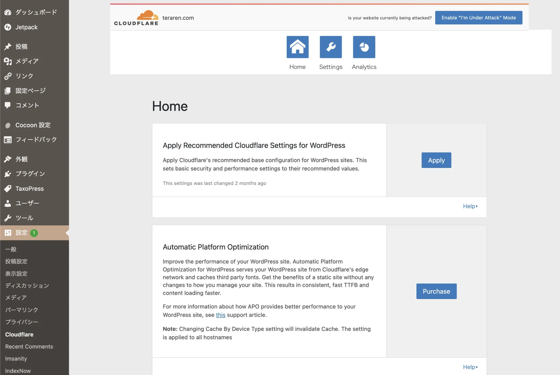 WordPress用にCloudflareのプラグインが用意されています。