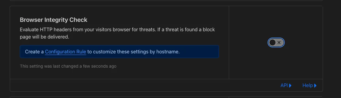 Security > Settingメニューに有るBrowser Integrity Checkはオフにしたほうが良さそうです。プログラムからアクセスされるAPIサービスを運用していると、このルールによってblockされているリクエストが存在します。
