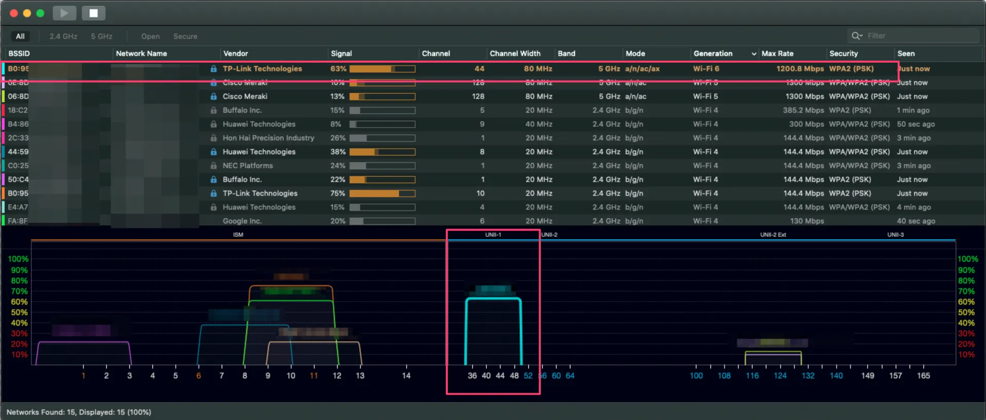 WiFi Explorer Liteで見てみた感じはこちら。設定は基本的にデフォルトです。帯域をかなり占領しております。家の周辺にはWi-Fi 6に対応したアクセスポイントは見当たりません!一番乗り。