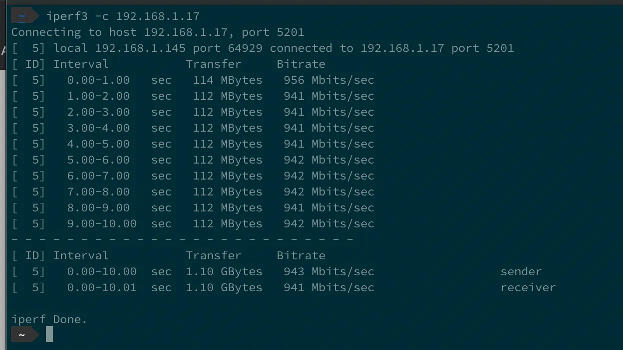 まず、ベンチマーク先であるノードへの有線LANがボトルネックにならないかを確認します。一応理論上WiFi6は現時点で1200Mbps出るらしいので。